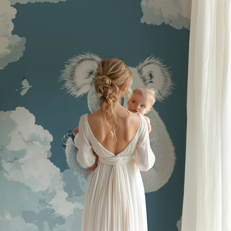Le papier peint Koala Caché Dans Un Nuage présente un design unique où les koalas câlins se mêlent habilement aux nuages vaporeux. La couleur bleue douce et les nuances délicates de blanc et gris rendent ce motif particulier et apaisant.