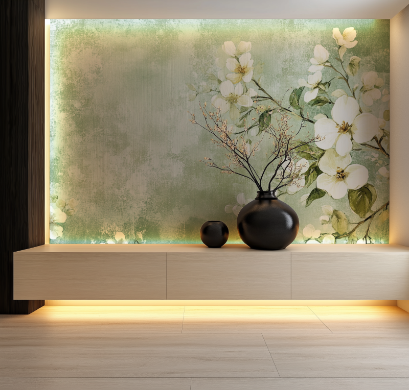 Les fleurs sont magnifiquement détaillées, apportant une texture et une profondeur visuelle qui enrichissent n'importe quelle pièce. Ce papier peint est idéal pour ceux qui souhaitent une décoration intérieure raffinée et pleine de subtilité.