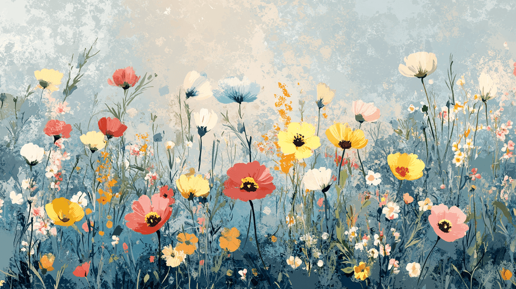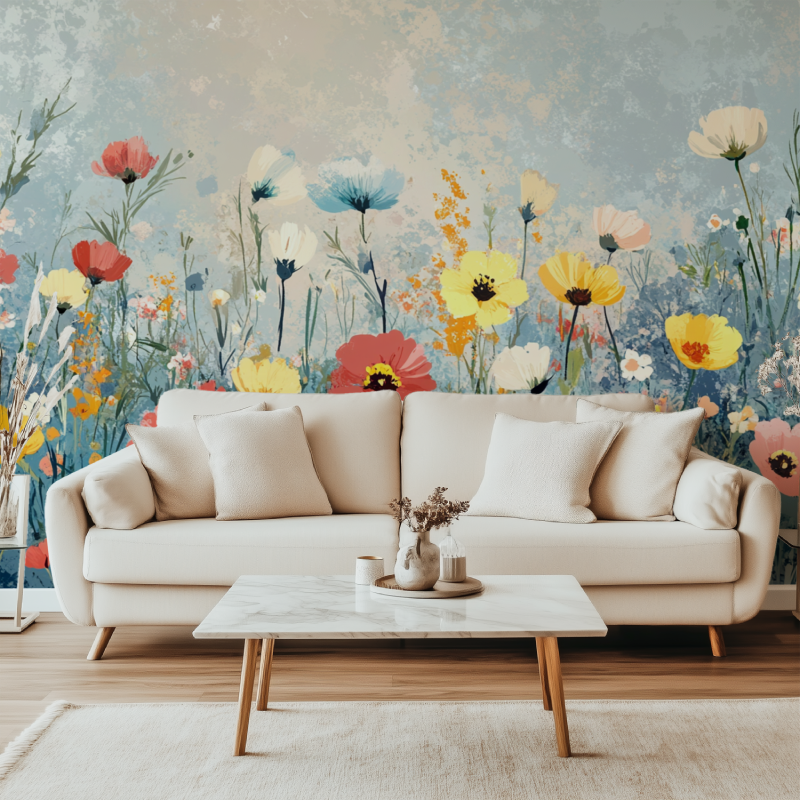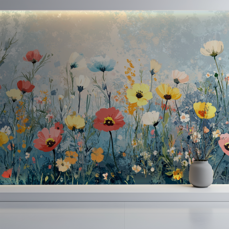 This wallpaper captures the essence of nature with flowers in vibrant colors such as red, yellow and blue, creating a joyful atmosphere . The flowers almost seem to come to life thanks to the depth effect and the multitude of shades used, making the wall a real focal point of the interior design.