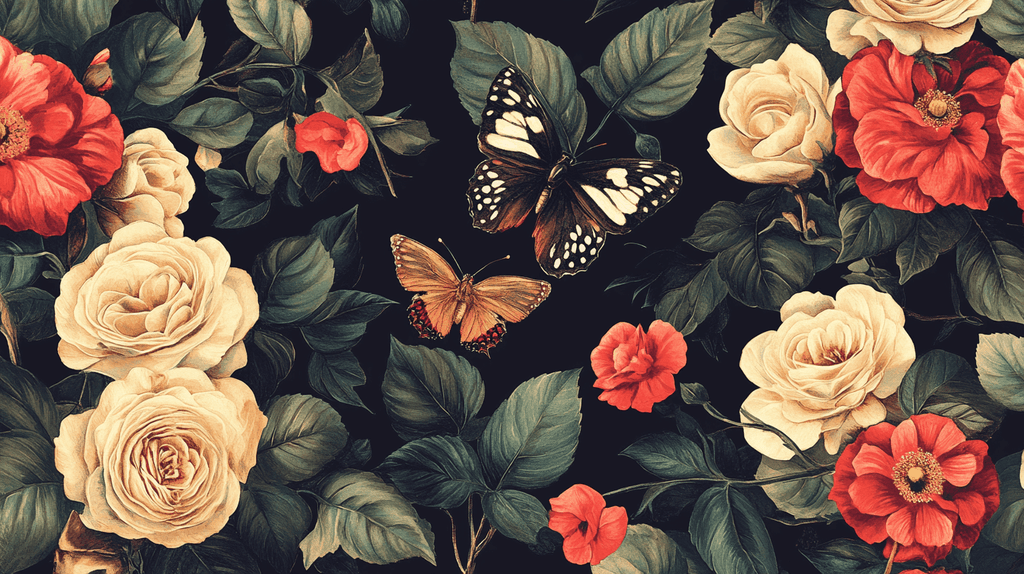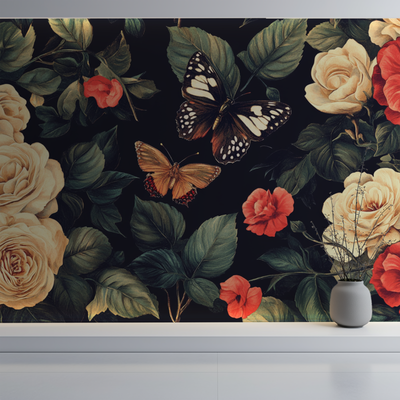 Le Papier Peint Fleur Animaux expose un motif harmonieux aux couleurs intenses, intégrant habilement des éléments de fleurs et d'animaux. Le fond sombre met en valeur les nuances vives des fleurs rouges, blanches et oranges, créant un ensemble visuel équilibré et saisissant.
