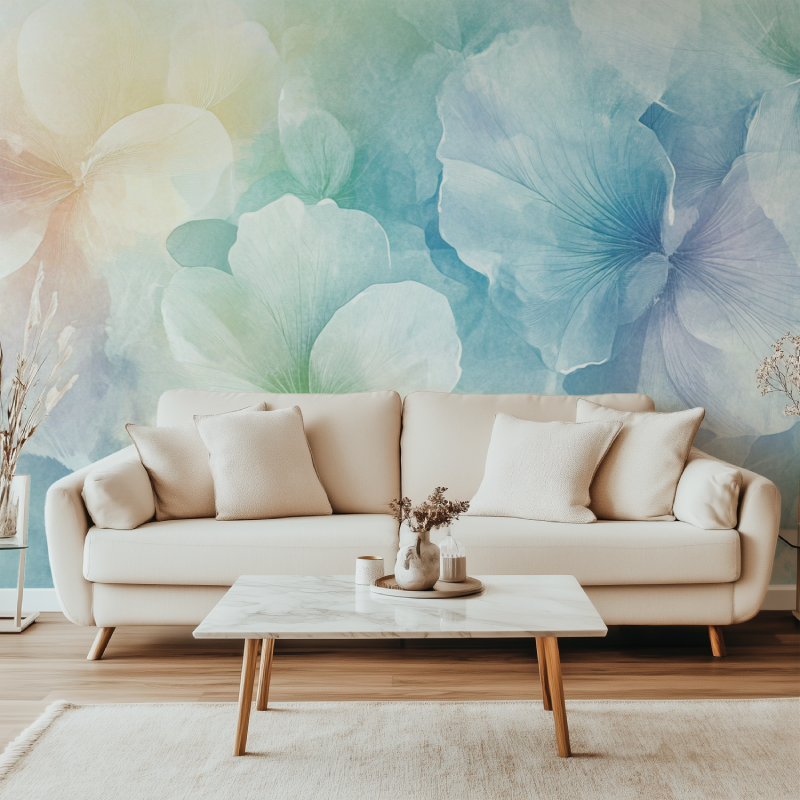 Le Papier Peint Fleur Aquarelle incarne une fusion délicate de couleurs douces et de motifs floraux subtils, qui le rendent irrésistiblement attrayant. Les grandes fleurs aquarelles, avec leurs teintes de bleu et de vert mélangées à des nuances pastels, créent une atmosphère apaisante et stimulante.