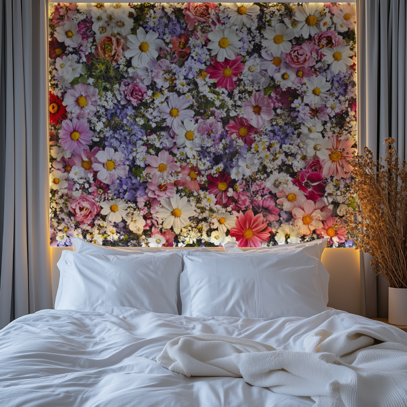 Ces couleurs, combinées à une disposition harmonieuse, apportent une touche de nature directement à votre intérieur. Le design floral est parfait pour ceux qui cherchent à introduire une ambiance joyeuse et apaisante à leur espace de vie, en suivant les tendances actuelles de décoration intérieure axées sur la nature et le bien-être.